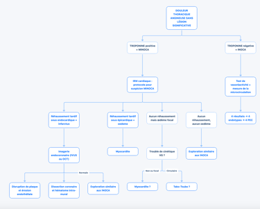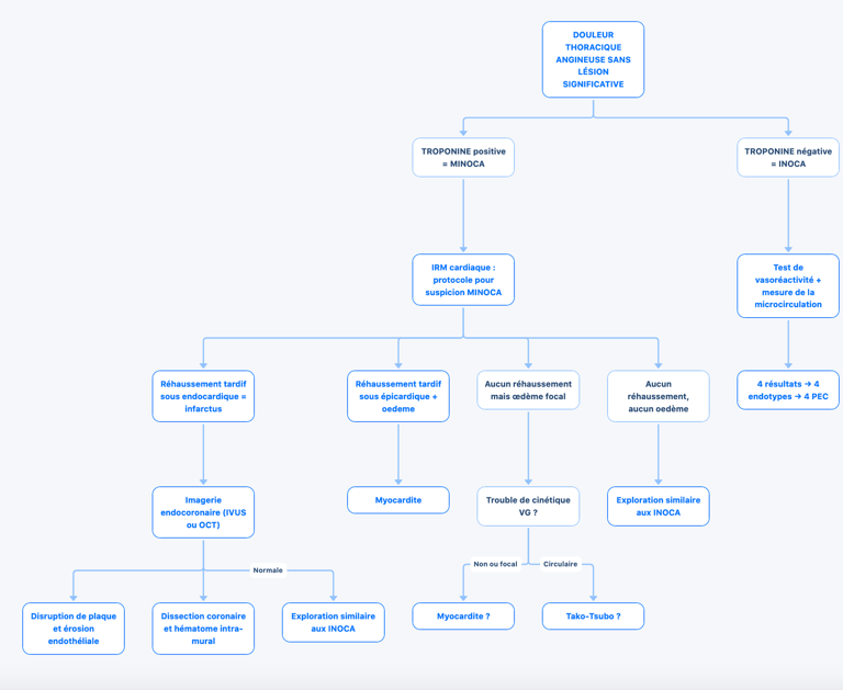 Les INOCA/MINOCA sont des pathologies fréquentes : elle intéressent 60% des coronarographies sans atteinte obstructive angiographique coronaire des patients angineux, et jusqu’à 15% des SCA. INOCA et MINOCA sont des diagnostics de travail en attente de diagnostic étiologique. La prise en charge dépend de l’endotype déterminé par une procédure invasive combinant un test de vasoréactivité coronaire (methergin ou acétylcholine) et mesure de la microcirculation coronaire. La recherche et le traitement des INOCA conditionnent l’amélioration de l’angor et la qualité de vie ainsi que le pronostic.